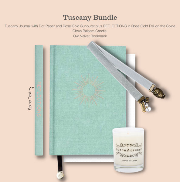 - 6 5/16 "x 9" Tuscany Journal with Sunburst Icon in Rose Gold Foil on cover and "REFLECTIONS" in Rose Gold Foil on spine and 180 dot note pages